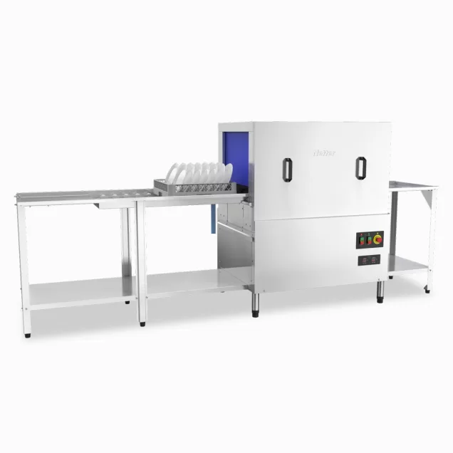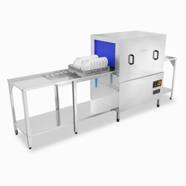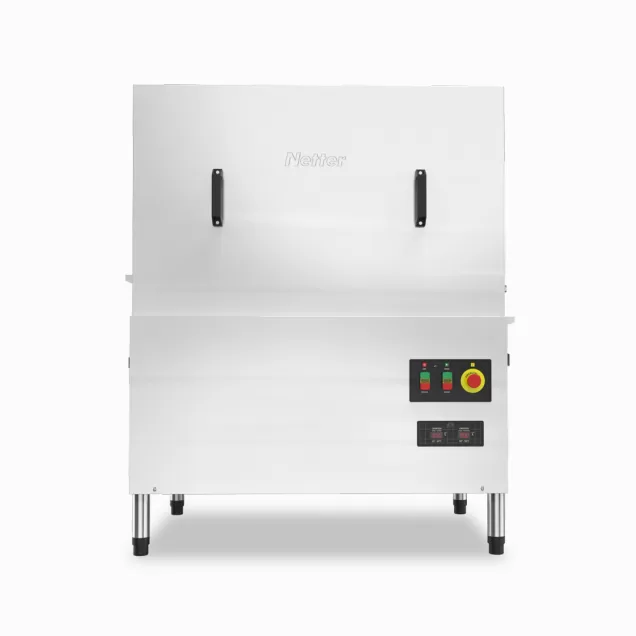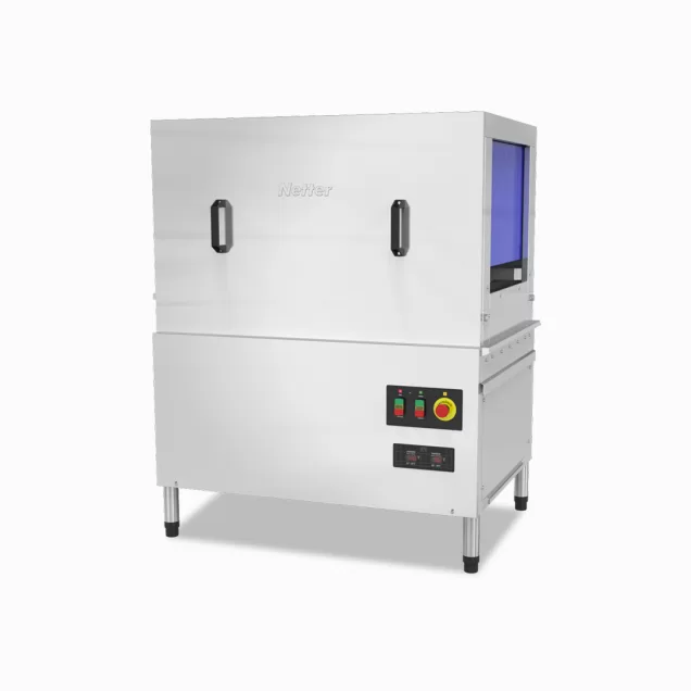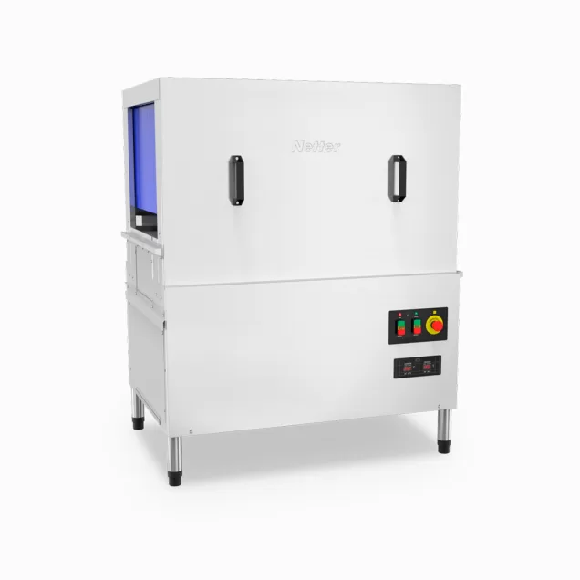 A lava-louças NT 810 da Netter é uma solução de alta capacidade e eficiência para grandes estabelecimentos comerciais. Com um desempenho notável, esta máquina pode processar até 150 gavetas por hora, permitindo a limpeza de até 2.700 pratos por hora, utilizando apenas 177 ml de água por prato e mantendo um baixo consumo de detergente e tensoativo.